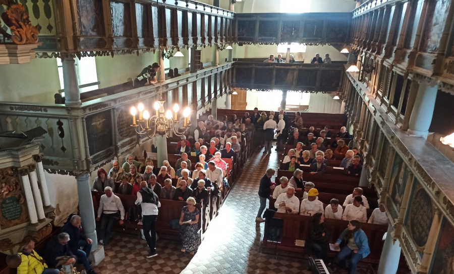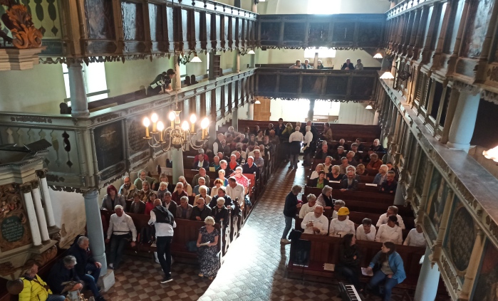 Am 21.05 trafen sich dann alle um 18 Uhr zur Begrüßung. Und diese fand erstmals in einer Kirche statt und war für alle etwas ganz besonderes. Die Inneneinrichtung der Roßdorf/Rhöner Kirche im frühbarocken Stiel mit zahllosen Holzbemalungen und Texten und die Steinmeier-Orgel beeindruckte schon beim Betreten des Gotteshauses. Die Orgel spielte das Prelude des 7. Te Deums von Charpentier - die Eurovisionsmelodie - und die Gemeinde sang dazu. Uwe Wichler begrüßte für die Gastgeber, die dann mit musikalischen Beiträgen ihre Gemeinde bzw. Land vorstellten. Die Böner Freunde präsentierten in schönen Bergmannsuniformen das Steigerlied und Hochprozentiges. Wir hatten das Hessenlied "Ich kenne ein Land" und eine eigene zweite Strophe "Ich kenne ein Rad" mitgebracht. Kati und Hilde - Tochter und Enkeltochter von Helmut Wichler, Bürgermeister a.D bereicherten mit Geige, Klavier, Gitarre und Gesang das Programm. Für den Kirchenvorstand sprach Tally Maat, über die wir noch berichten werden.