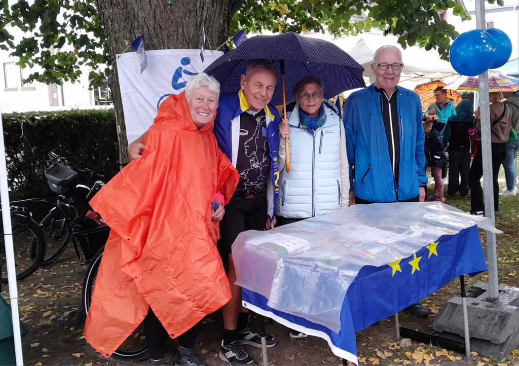 Froh waren wir über unseren Inforad-Stand unter einem großen Baum, der uns lange guten Schutz vor dem leider später einsetzenden Regen bot. Nach dieser Präsentation ging es wetterfest angezogen per Rad in die Heimatgemeinden der Radler zurück und der Tacho zeigte bis zu 62 Tageskilometer an.